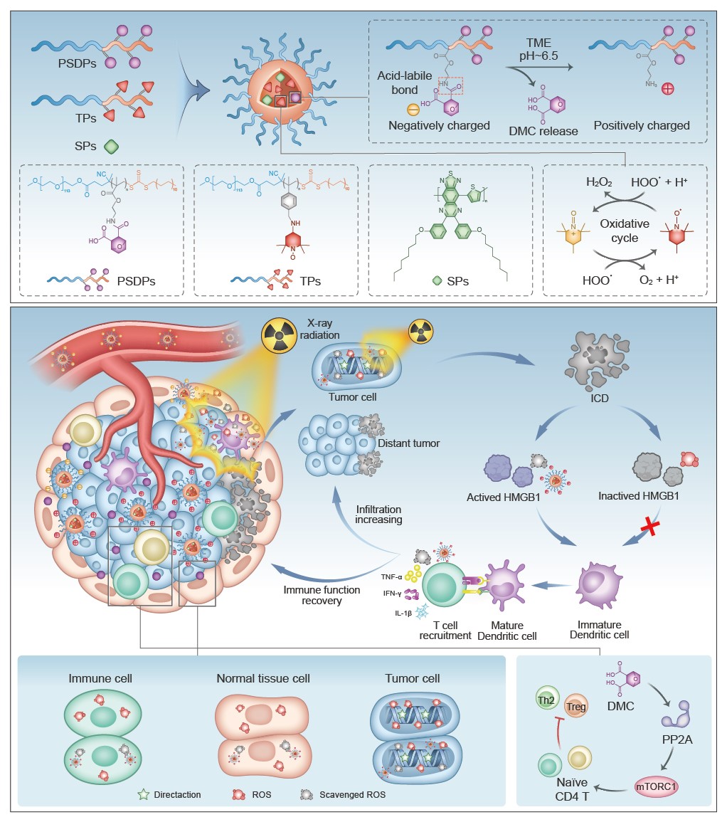 近日,OD(中国)一站式服务平台杨震教授团队在国际材料学顶尖期刊《Advanced Materials》发表题为“Immunoregulatory Engineering of Semiconducting Charge-reversal Nanoantioxidant for Ameliorating Cancer Radioimmunotheranostics”的研究性论文。文章介绍了一种多功能X射线诊疗纳米抗氧化剂(XTN)用于调节抑制型肿瘤免疫微环境和减小正常组织辐射损伤,从而建立提高放射治疗效果同时减小放疗副作用的策略。XTN具有近红外二区光声成像能力,能精准识别肿瘤边界,提高放疗辐射准确性,并通过清除肿瘤微环境中的活性氧,增强免疫原性,引发抗肿瘤免疫反应。XTN能在肿瘤的酸性微环境中特异性释放免疫调节剂DMC,从而抑制调节性T细胞分化,解除其对T细胞免疫功能的抑制。这种协同改善肿瘤免疫微环境的策略不仅增强了放射治疗疗效,还保护了辐照脱靶区的正常组织,提高了正常组织的耐受剂量,降低了脱靶副作用。这种治疗策略通过调控肿瘤微环境最大限度地提高对肿瘤细胞的杀伤效果,并尽可能减少对正常组织的损伤,为放射治疗学的提供了重要参考。